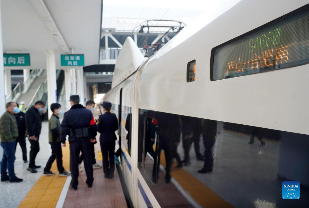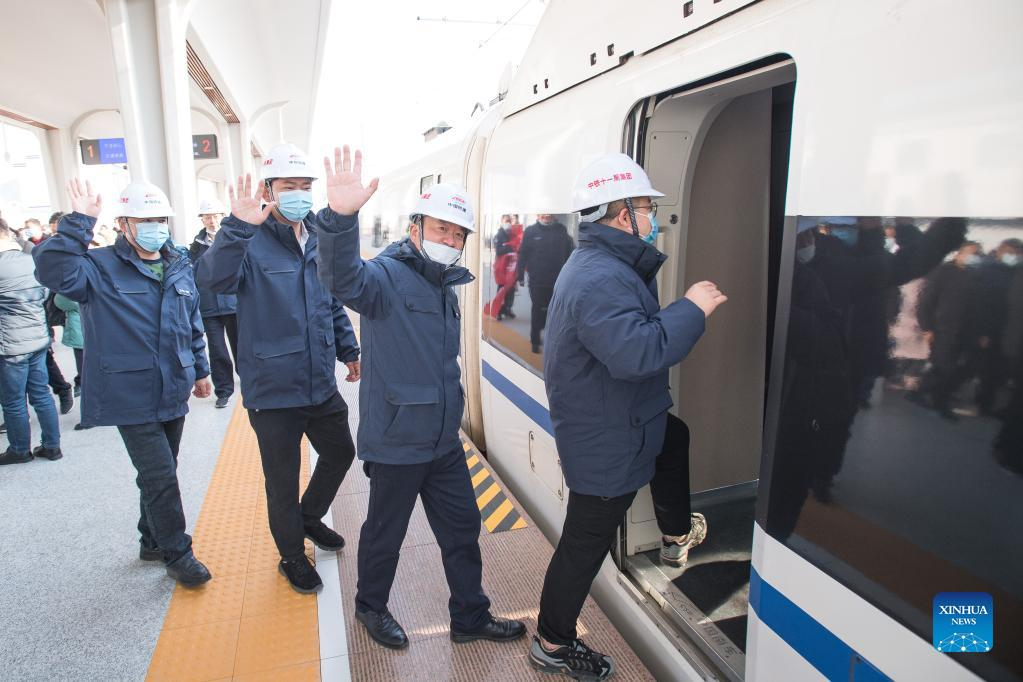 Construction workers of the Anqing-Jiujiang high-speed railway get on a train at the Huangmei East Railway Station in Huangmei County, central China's Hubei Province, Dec. 30, 2021. A new high-speed railway section linking Anqing City in east China's Anhui Province, with Jiujiang City in east China's Jiangxi Province began operation Thursday. The 176-km line, with seven stations along its route, will reduce travel time between Anhui's capital Hefei and Jiangxi's capital Nanchang to two hours and 22 minutes, according to China Railway Shanghai Group Co., Ltd. The Anqing-Jiujiang high-speed railway has a designed speed of 350 km per hour and is connected to China's vertical artery of the Beijing-Hong Kong Railway. (Xinhua/Xiao Yijiu)