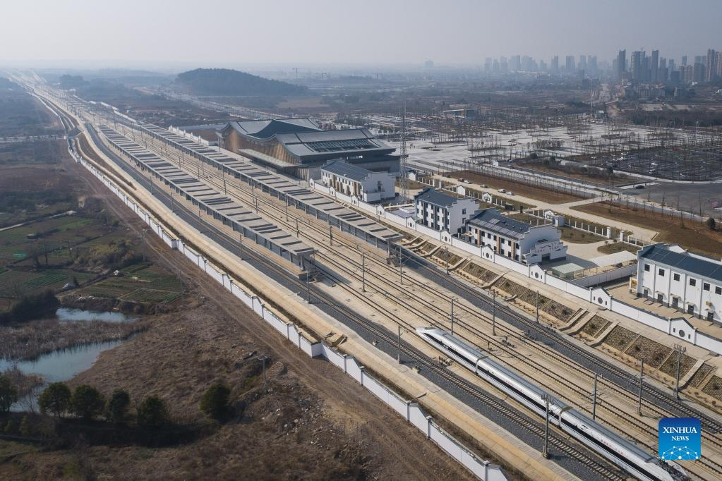 A high-speed railway train is seen at the Susong East Railway Station in Susong County, east China's Anhui Province, Dec. 30, 2021. A new high-speed railway section linking Anqing City in east China's Anhui Province, with Jiujiang City in east China's Jiangxi Province began operation Thursday. The 176-km line, with seven stations along its route, will reduce travel time between Anhui's capital Hefei and Jiangxi's capital Nanchang to two hours and 22 minutes, according to China Railway Shanghai Group Co., Ltd. The Anqing-Jiujiang high-speed railway has a designed speed of 350 km per hour and is connected to China's vertical artery of the Beijing-Hong Kong Railway. (Xinhua/Liu Junxi)