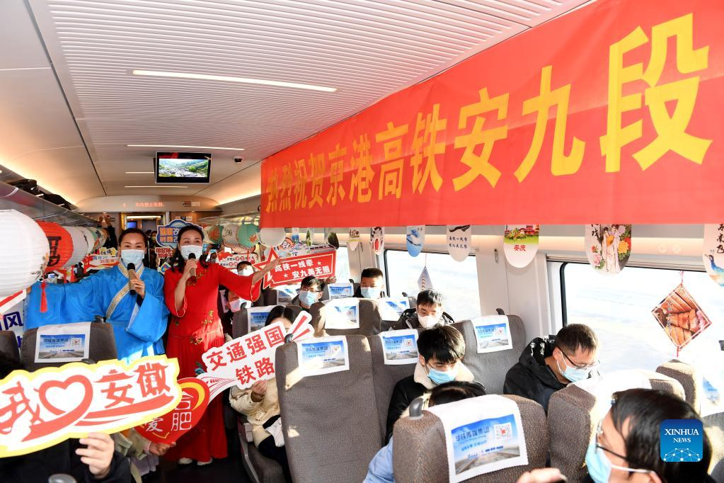 Crew members stage a performance during a ceremony on a high-speed railway train running from Hefei in east China's Anhui Province to Shenzhen in south China's Guangdong Province, Dec. 30, 2021. A new high-speed railway section linking Anqing City in east China's Anhui Province, with Jiujiang City in east China's Jiangxi Province began operation Thursday. The 176-km line, with seven stations along its route, will reduce travel time between Anhui's capital Hefei and Jiangxi's capital Nanchang to two hours and 22 minutes, according to China Railway Shanghai Group Co., Ltd. The Anqing-Jiujiang high-speed railway has a designed speed of 350 km per hour and is connected to China's vertical artery of the Beijing-Hong Kong Railway. (Xinhua/Liu Junxi)