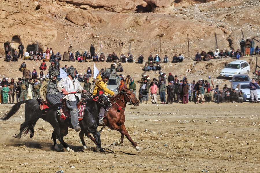 KABUL, Dec. 30 (Xinhua) -- Buzkashi, meaning "goat grabbing", is a centuries-old traditional game in Afghanistan, in which skilled horse riders of rival teams compete to take the slaughtered goat or calf and throw it in a circle fixed on the Buzkashi ground.