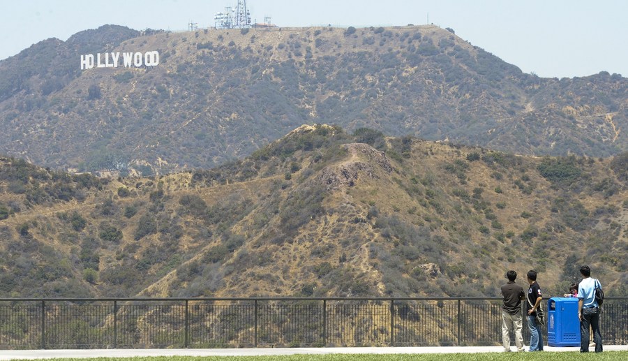 File photo taken on June 28, 2009 shows people looking at the Hollywood sign standing on a hill in Los Angeles, the United States. (Xinhua/Qi Heng)