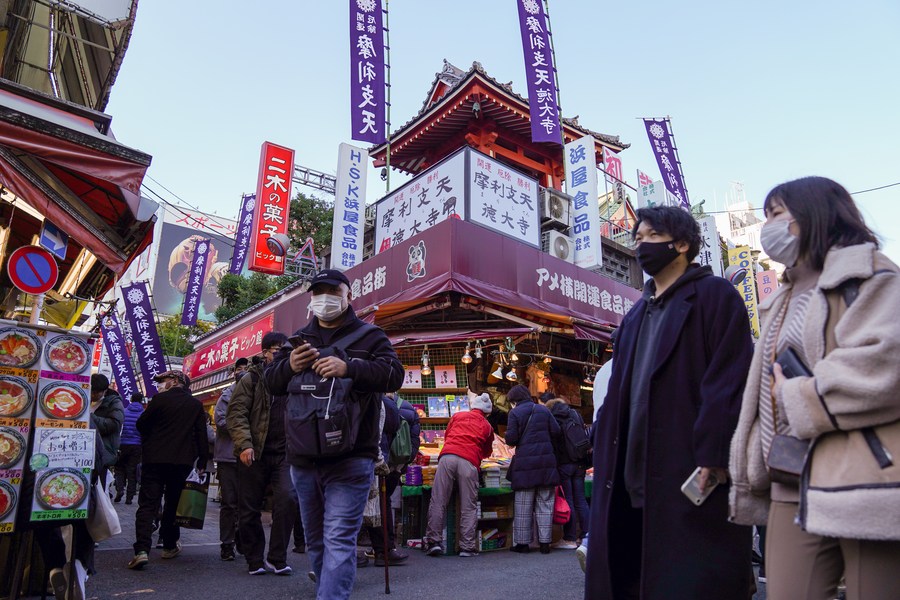 People shop at Ameyoko market street during year-end sales in Tokyo, Japan on Dec. 28, 2021. (Photo by Christopher Jue/Xinhua)