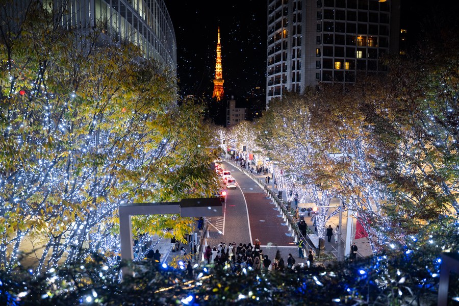 Photo taken on Dec. 4, 2021 shows the night view of a street decorated with lights for Christmas and New Year in Roppongi District of Tokyo, Japan. (Xinhua/Zhang Xiaoyu)
