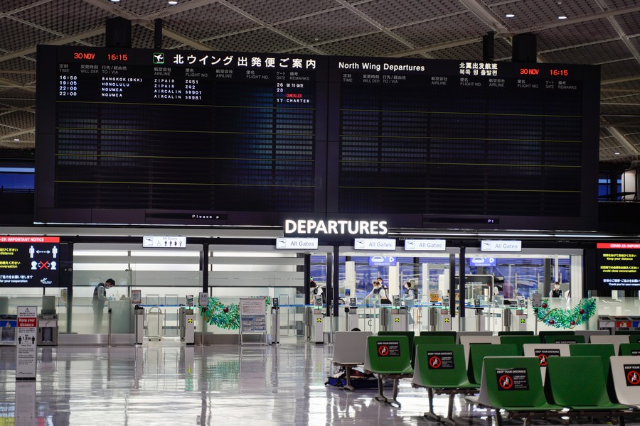 Photo taken on Nov. 30, 2021 shows the international departures gate of Narita airport in Tokyo, Japan. Japanese Prime Minister Fumio Kishida decided on Nov. 29 to suspend entry of all foreign visitors from around the world to guard against the Omicron COVID-19 variant. (Xinhua/Zhang Xiaoyu)