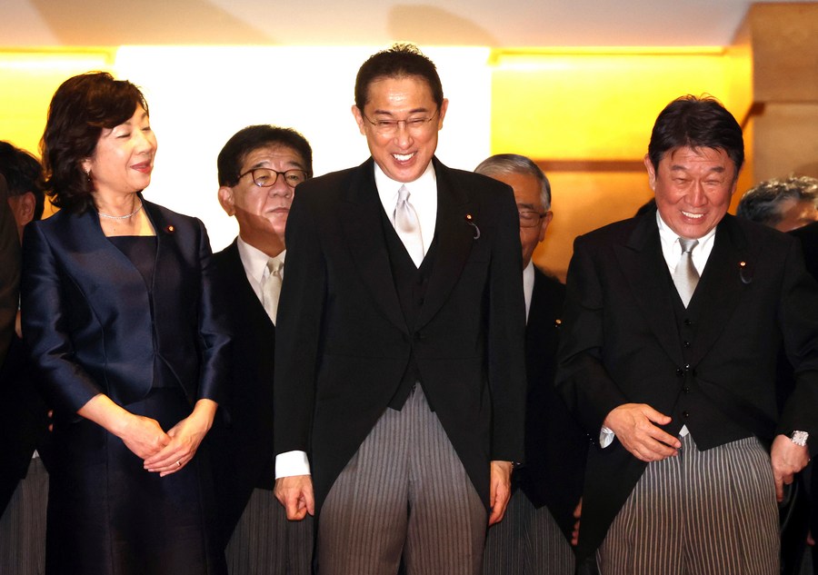 Japan's new Prime Minister Fumio Kishida (C) smiles before a photo session with his cabinet members at the prime minister's official residence in Tokyo, Japan, on Oct. 4, 2021. (Yoshikazu Tsuno/Pool via Xinhua)