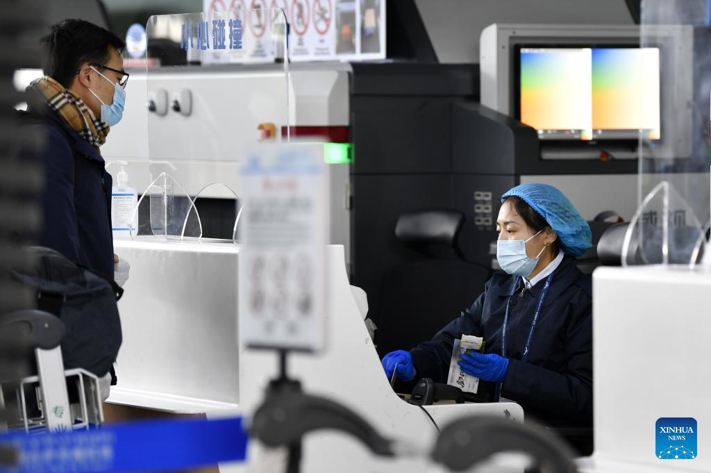A ground service staff member helps a passenger to check in at Gonggar Airport in Lhasa, southwest China's Tibet Autonomous Region, Dec. 30, 2021. With the landing of flight TV9850, the annual passenger throughput of civil aviation in Tibet exceeded six million Thursday. The region now operates 150 domestic and international flight routes. (Xinhua/Zhang Rufeng)