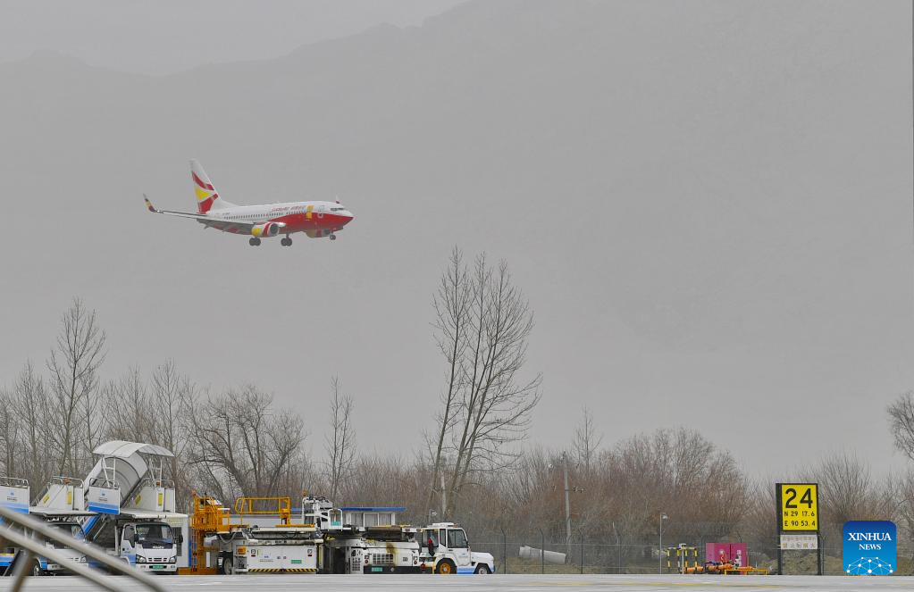 An aircraft flies over Gonggar Airport in Lhasa, southwest China's Tibet Autonomous Region, Dec. 30, 2021. With the landing of flight TV9850, the annual passenger throughput of civil aviation in Tibet exceeded six million Thursday. The region now operates 150 domestic and international flight routes. (Xinhua/Zhang Rufeng)