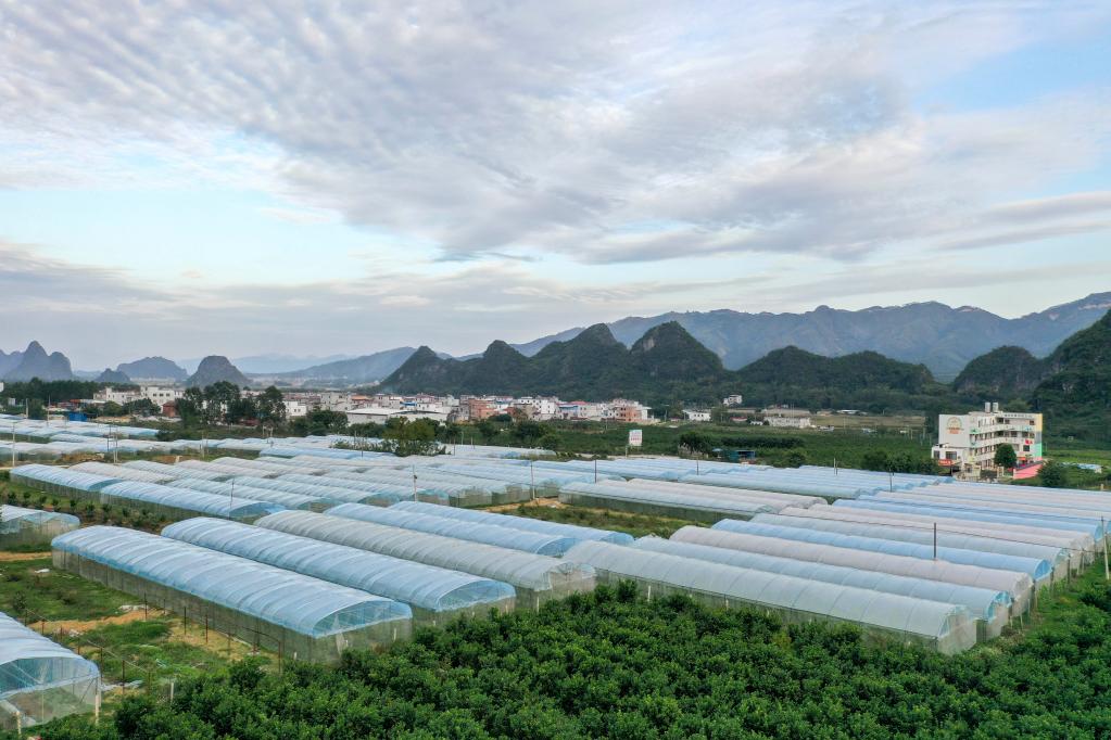 Aerial photo taken on Nov. 23, 2021 shows a vegetable and fruit planting base in Tongling Town of Wuxuan County in south China's Guangxi Zhuang Autonomous Region. (Xinhua/Cao Yiming)■