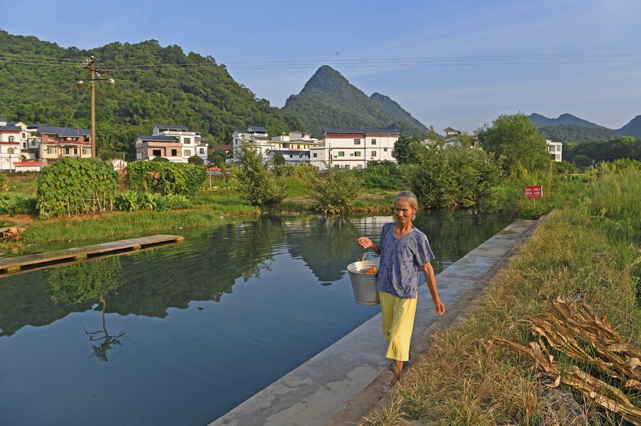 An elder holding a bucket of clothes walks in Laoya Village of Zhangjia Township in Pingle County, south China's Guangxi Zhuang Autonomous Region, July 16, 2021. (Xinhua/Zhou Hua)