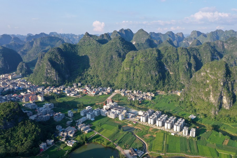 Aerial photo taken on Sept. 2, 2021 shows a poverty alleviation relocation site and its surrounding areas in Dongmiao Township of Du'an Yao Autonomous County, south China's Guangxi Zhuang Autonomous Region. (Xinhua/Lu Boan)