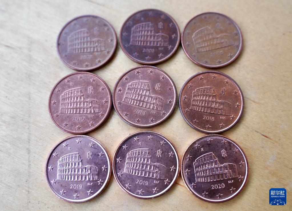 The Colosseo patterns are seen on the back of 5-cent coins in Rome, Italy, Dec. 30, 2021. Euro banknotes and coins were physically introduced into eurozone countries in circulation on Jan. 1, 2002.