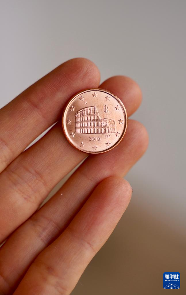 The Colosseum pattern is seen on the back of the 5-cent coin in Rome, Italy, Dec. 30, 2021. Euro banknotes and coins were physically introduced into eurozone countries in circulation on Jan. 1, 2002.