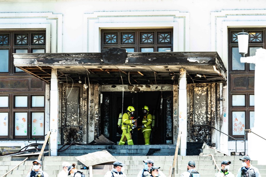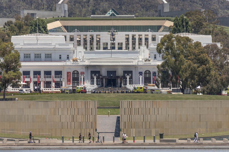Firefighters clean up the fire-damaged entrance to Old Parliament House in Canberra, Australia, Dec. 30, 2021. (Xinhua)