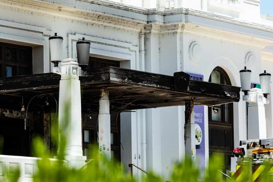 Photo taken on Dec. 30, 2021 shows the fire-damaged front entrance of the Old Parliament House in Canberra, Australia. (Xinhua)