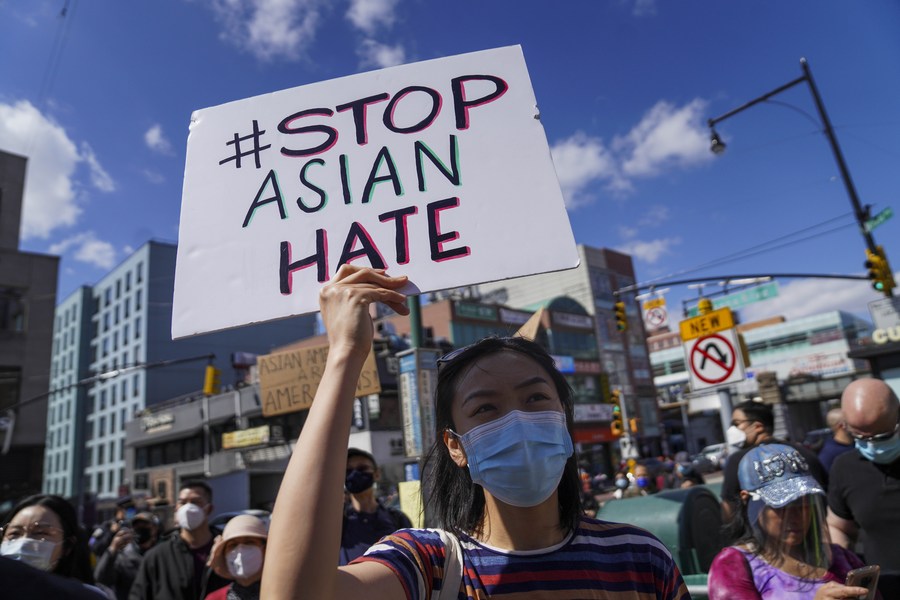 People attend a rally against racism and violence on Asian Americans in Flushing of New York, the United States, March 27, 2021. (Xinhua/Wang Ying)
