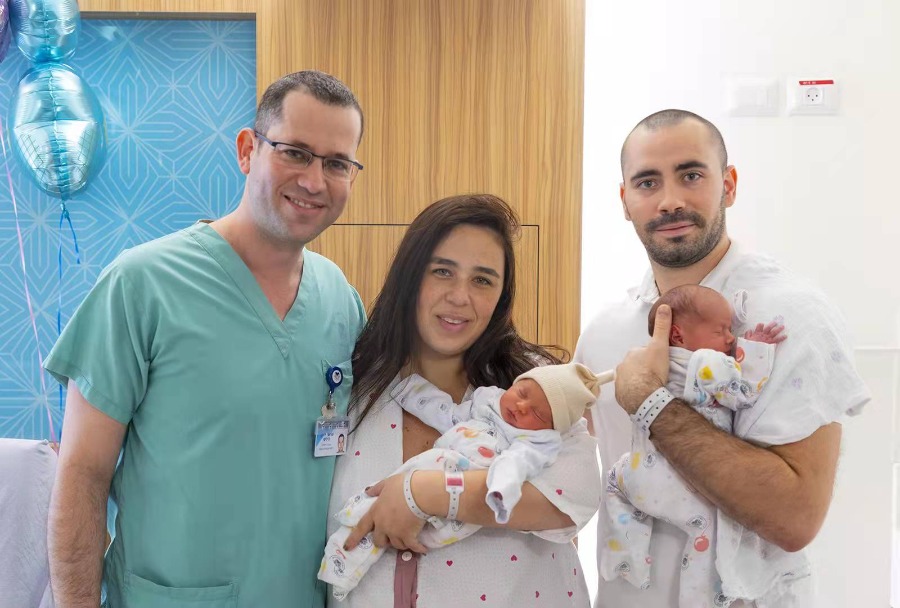 Undated photo shows Elle (R2) and David (R1) Ladovitch holding their twins born from two wombs, along with their obstetrician at Ichilov Hospital in the Israeli coastal city of Tel Aviv. (Photo provided by Ichilov Hospital)