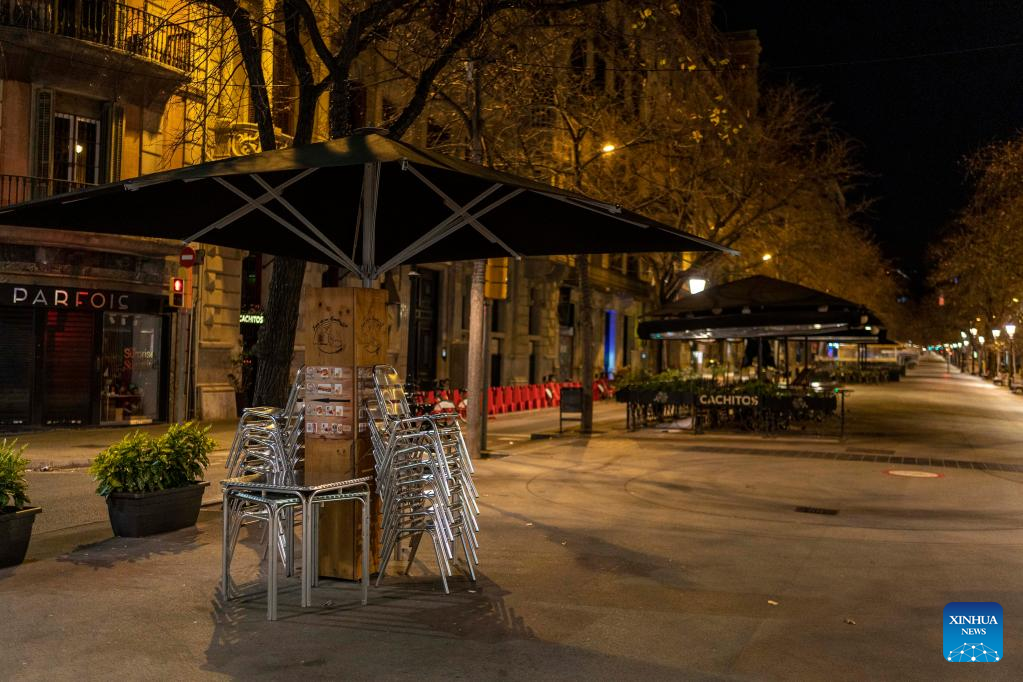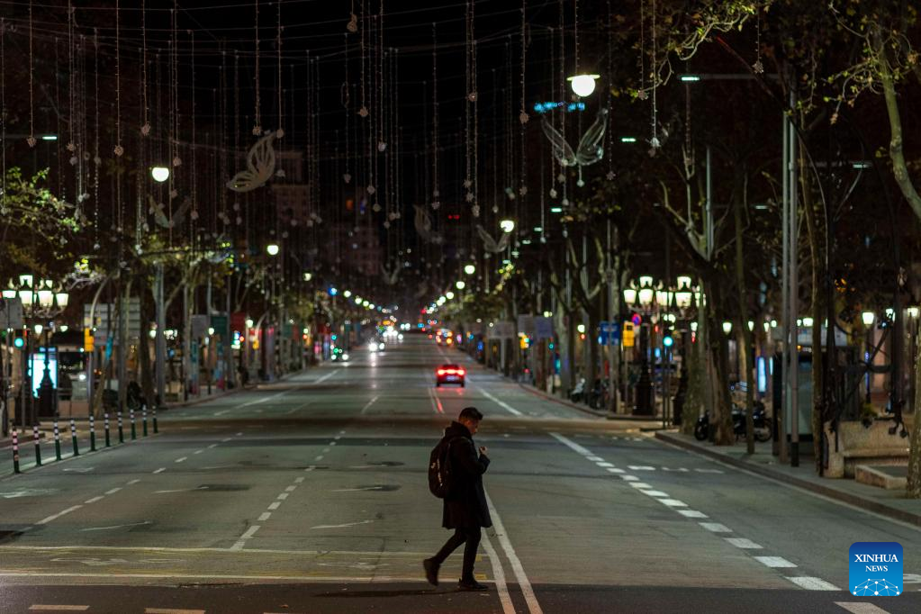 Photo taken on Dec. 29, 2021 shows the night view during curfew in Barcelona, Spain. (Photo by Joan Gosa/Xinhua)