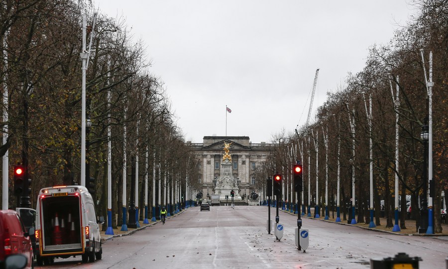 Photo taken on Dec. 21, 2020 shows The Mall in front of Buckingham Palace in London, Britain. (Xinhua/Han Yan)