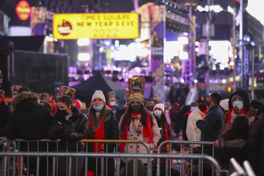 People attend the New Year celebrations at Times Square in New York, the United States, Dec. 31, 2021. (Xinhua/Wang Ying)