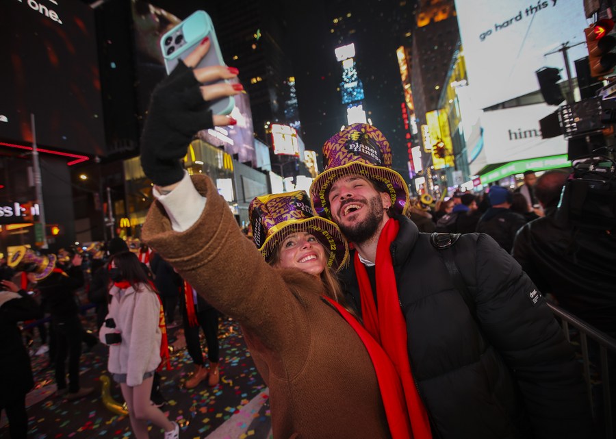 People celebrate the New Year at Times Square in New York, the United States, Jan. 1, 2022. (Xinhua/Wang Ying)