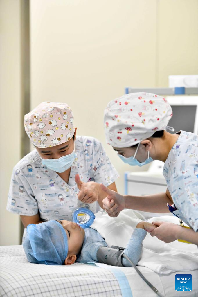 Medical workers encourage a 4-year-old child diagnosed with spinal muscular atrophy (SMA) after the injection of Spinraza at a hospital in Zaozhuang, east China's Shandong Province, Jan. 1, 2022. China is striving to improve the diagnosis and treatment of rare diseases.