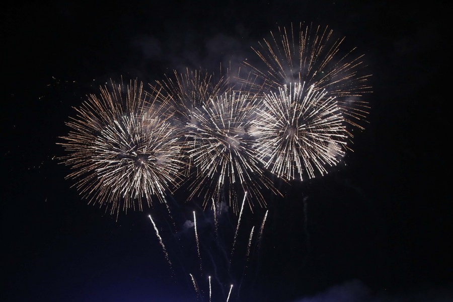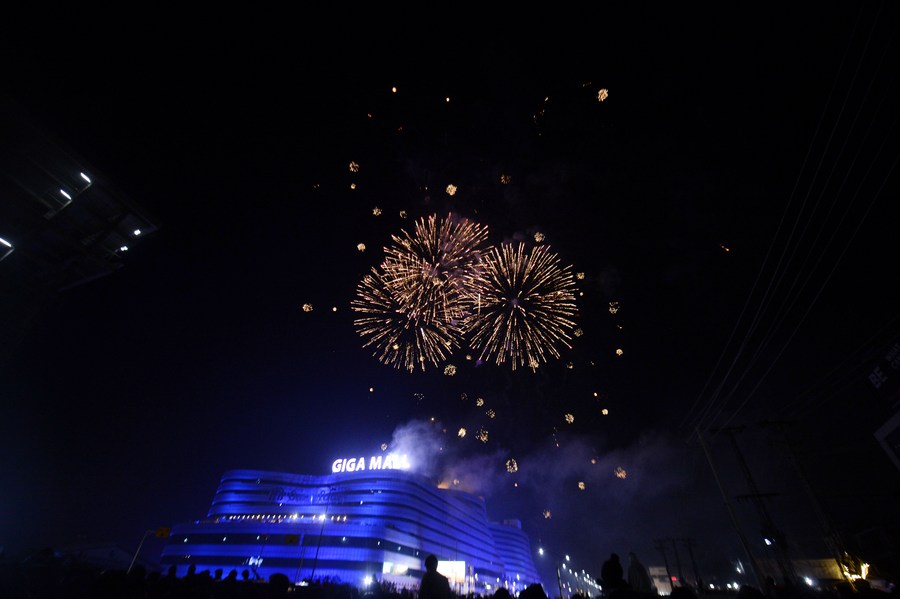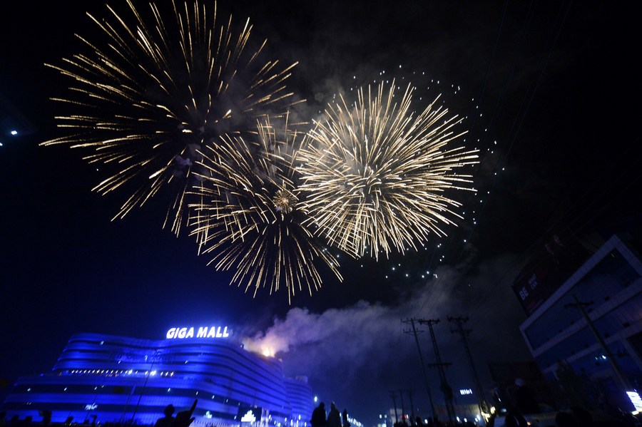 Fireworks explode during a New Year celebration in Rawalpindi, Pakistan, Jan. 1, 2022. (Xinhua/Ahmad Kamal)