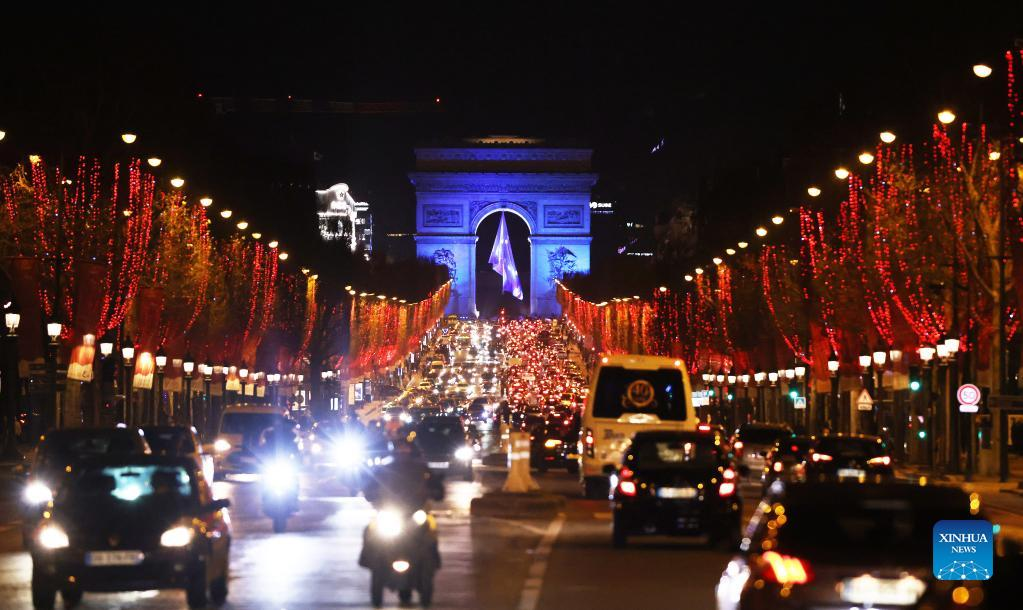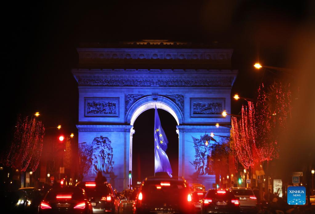 The Arc de Triomphe is lit up in blue to celebrate the start of the French presidency of the European Union in Paris, France, Jan. 1, 2022. The most emblematic landmarks in France turned blue Saturday night to mark French presidency of the EU. (Xinhua/Gao Jing)