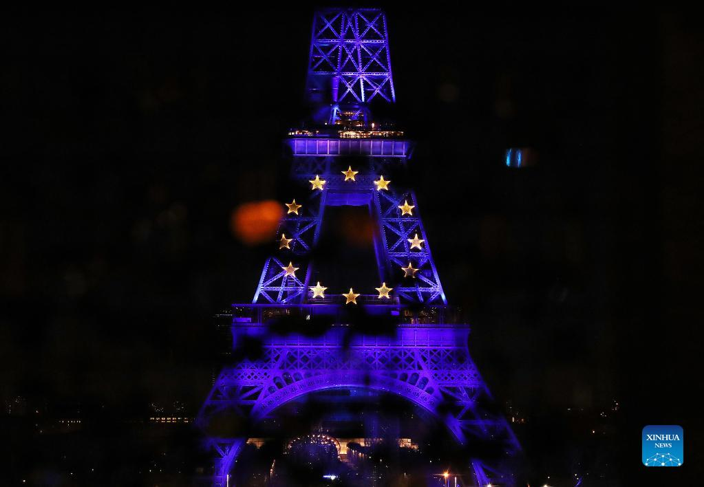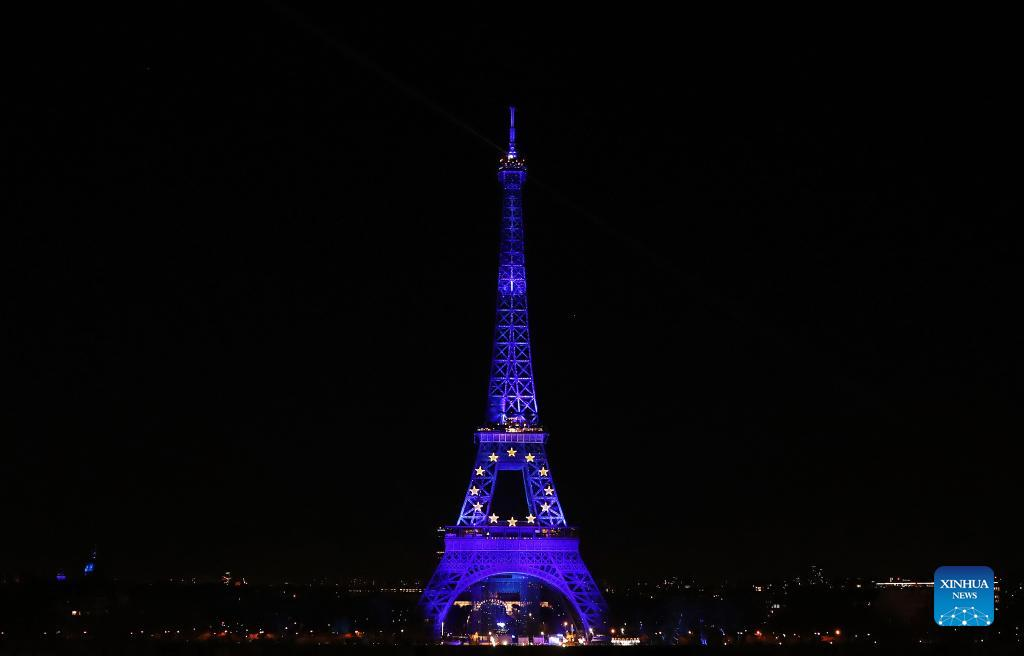 The Eiffel Tower is lit up in blue to celebrate the start of the French presidency of the European Union in Paris, France, Jan. 1, 2022. The most emblematic landmarks in France turned blue Saturday night to mark French presidency of the EU. (Xinhua/Gao Jing)