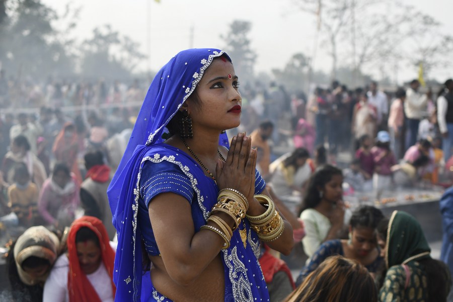 A devotee offers prayer at Maha Mrityunjay Temple in Nagaon district of India's northeastern state of Assam, Jan. 1, 2022. (Xinhua/Str)