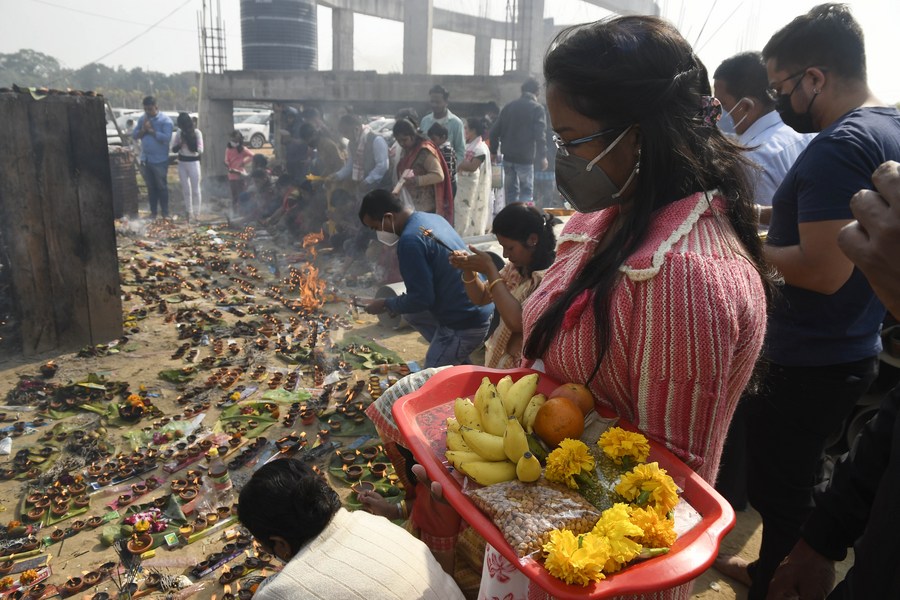Devotees light earthen lamps as they offer prayer at Maha Mrityunjay Temple in Nagaon district of India's northeastern state of Assam, Jan. 1, 2022. (Xinhua/Str) ■