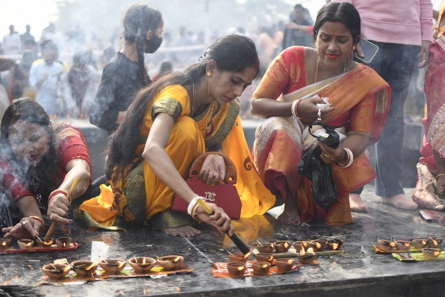 Devotees light earthen lamps as they offer prayer at Maha Mrityunjay Temple in Nagaon district of India's northeastern state of Assam, Jan. 1, 2022. (Xinhua/Str)