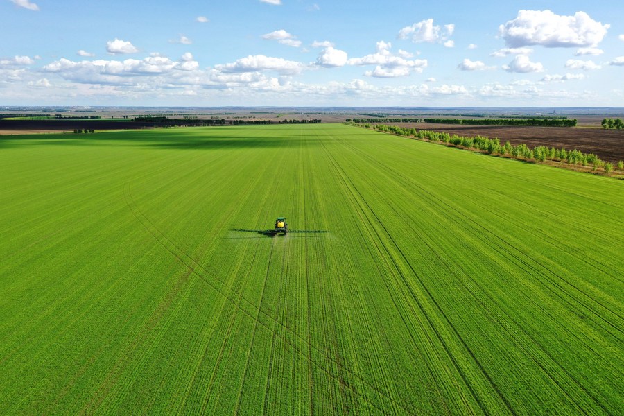Photo taken on May 27, 2021 shows a self-propelled sprayer at work on a farm in Heihe, northeast China's Heilongjiang Province. (Photo by Lu Wenxiang/Xinhua)