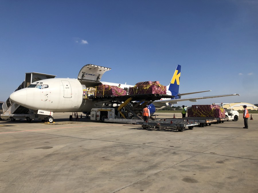 One of the freight airlifters touched down at Phnom Penh International Airport on Friday afternoon was K-Mile Air flight 8K802 from Bangkok, Thailand. The aircraft carried garments and general goods.