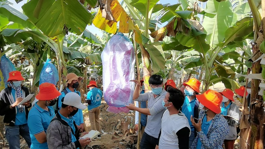Cambodian agriculture students visit a banana orchard in Kratie province, Cambodia, on Dec. 4, 2021. (Chen Qisheng/Handout via Xinhua)
