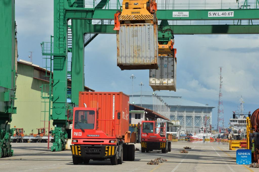 Photo taken on Jan. 1, 2022 shows containers being unloaded at the Muara Port, Brunei's largest deep-water port, in Bandar Seri Begawan, capital of Brunei. (Photo by Jeffrey Wong/Xinhua)