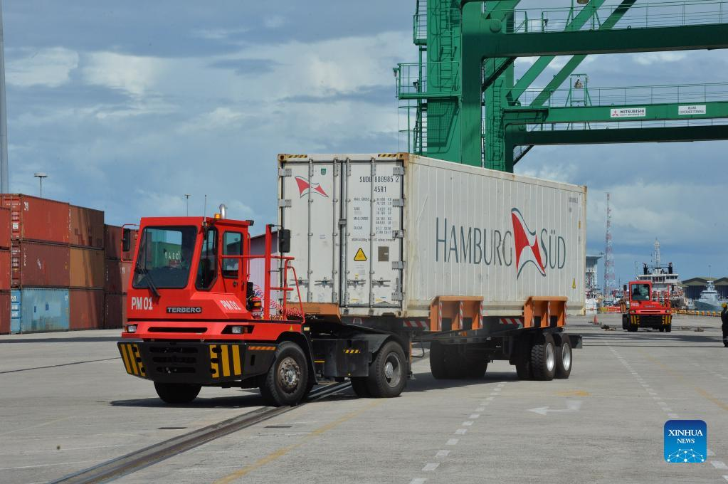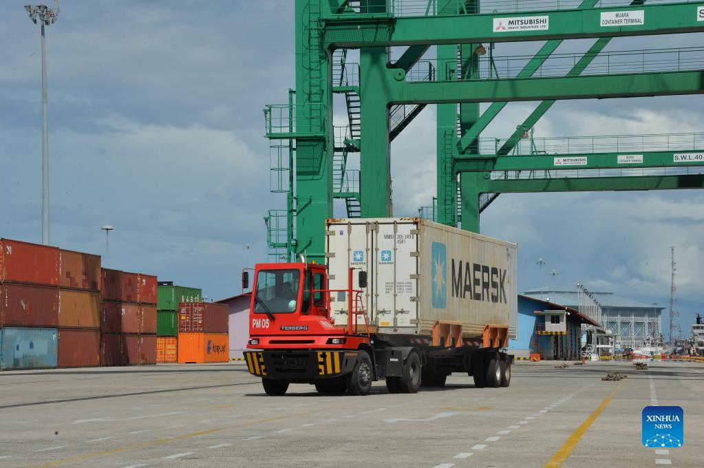 Photo taken on Jan. 1, 2022 shows a container being transported at the Muara Port, Brunei's largest deep-water port, in Bandar Seri Begawan, capital of Brunei.(Photo by Jeffrey Wong/Xinhua)