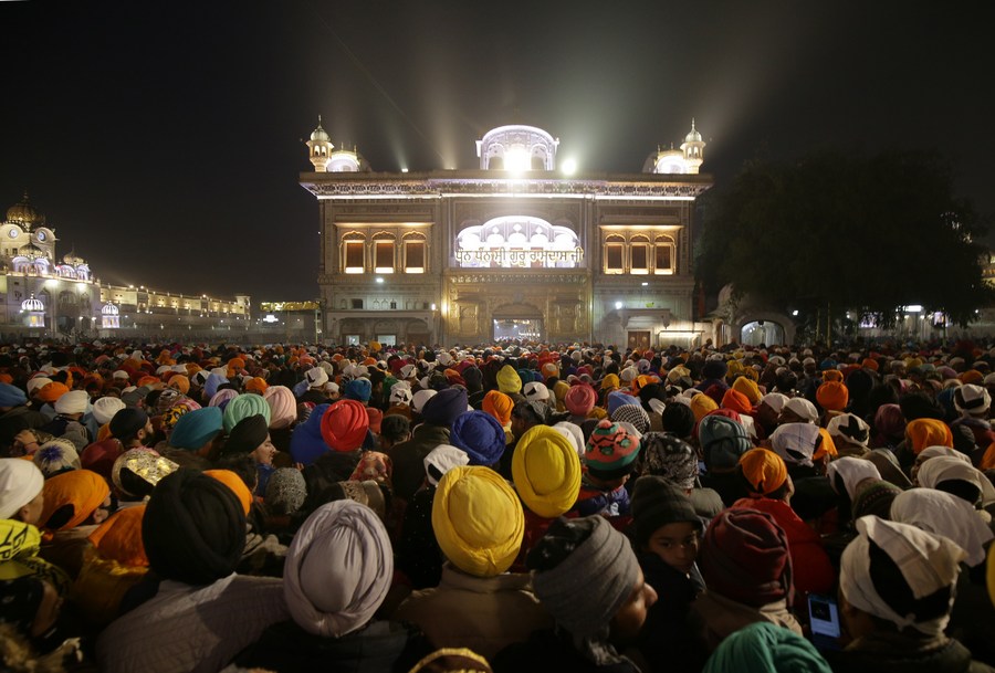 Devotees queue to pay obeisance in the pre-dawn hours at the Golden Temple on New Year's day in Amritsar of India's northern state of Punjab, Jan. 1, 2022. (Str/Xinhua)