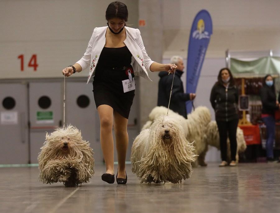 Participants are seen with dogs at the European Dog Show 2021 in Budapest, Hungary on Dec. 30, 2021. (Photo by Attila Volgyi/Xinhua)