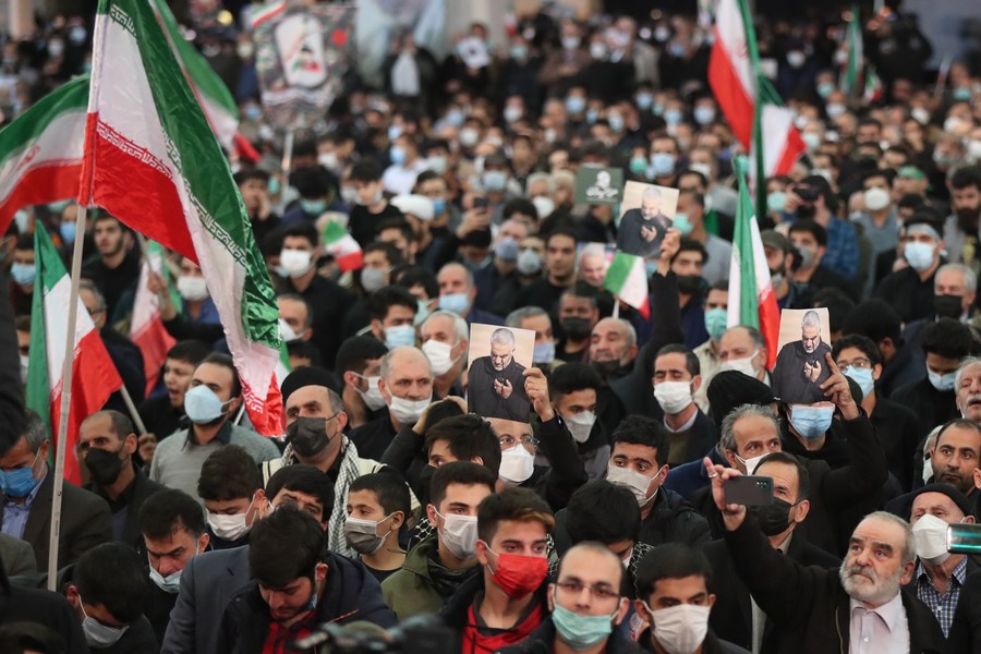 Iranian people attend a ceremony to mark the second anniversary of the U.S. assassination of top Iranian General Qassem Soleimani, in Tehran, Iran on Jan. 3, 2022. (Iranian Presidential Website/Handout via Xinhua)