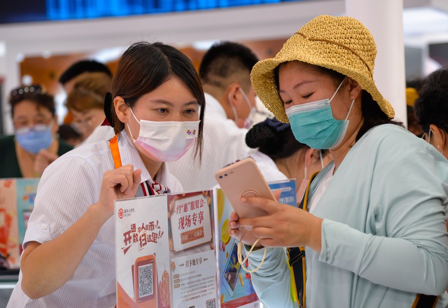 A visitor (R) consults about e-CNY business during the 2021 China International Fair for Trade in Services (CIFTIS) in Beijing, capital of China, Sept. 4, 2021. (Xinhua/Xu Qin)