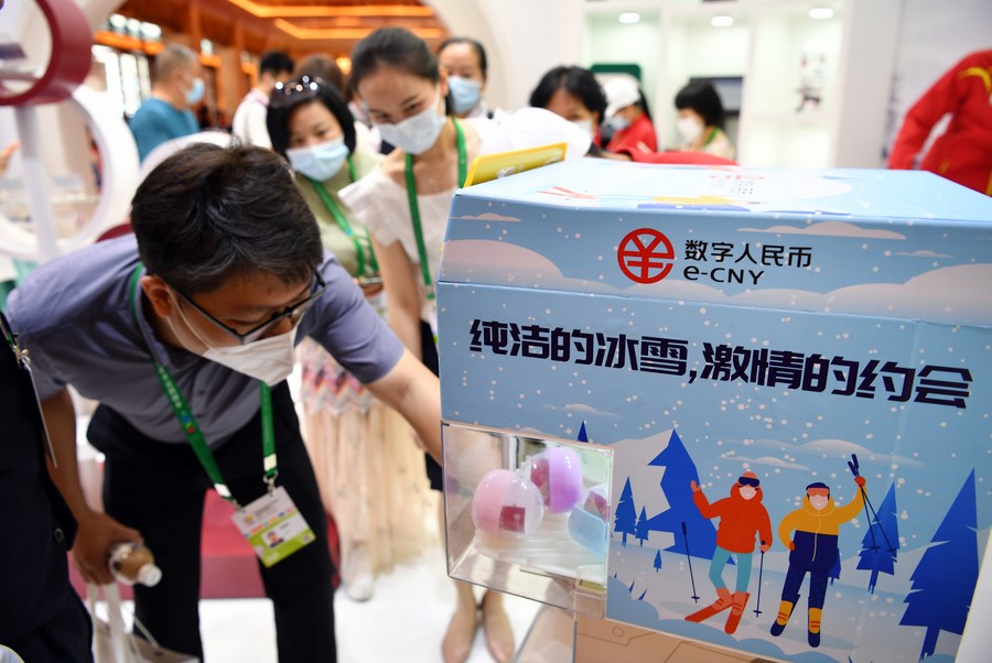 Photo shows the e-CNY booth in financial services exhibition hall during the 2021 China International Fair for Trade in Services (CIFTIS) in Beijing, capital of China, Sept. 4, 2021. (Xinhua/Xu Qin)