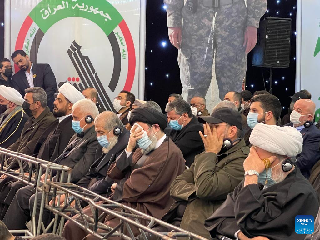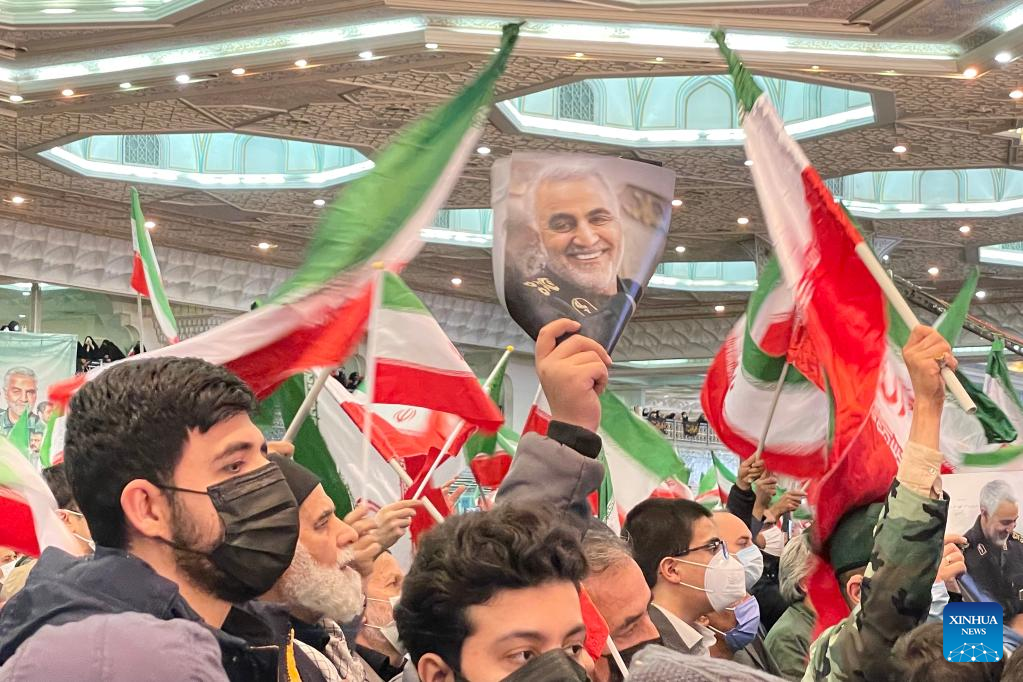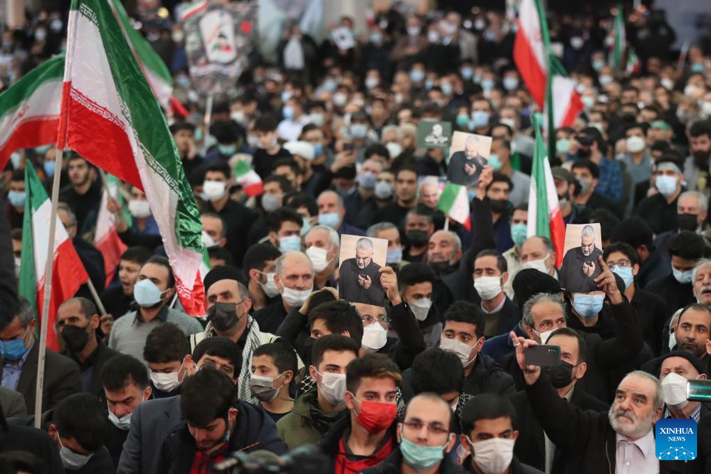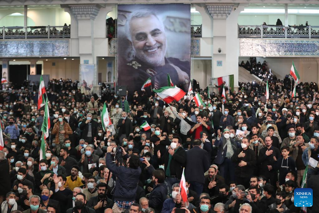 Iranian people attend a gathering to mark top Iranian General Qassem Soleimani's second martyrdom anniversary in Tehran, Iran, Jan. 3, 2022. Iranian President Ebrahim Raisi warned on Monday of Iran's revenge for the U.S. assassination of Iranian General Qassem Soleimani in case those involved in and behind the "criminal act" are not prosecuted through a just mechanism. (Xinhua/Gao Wencheng)