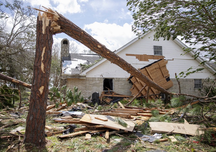 Photo taken on Dec. 11, 2021 shows a tree toppled in tornadoes in Mayfield, Kentucky, the United States. (Photo by Caromirna Sanchez/Xinhua)