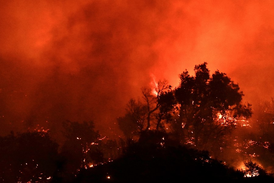 Flames and heavy smoke are seen in the Alisal Fire area, north of Santa Barbara County, California, the United States, Oct. 13, 2021. (Xinhua)