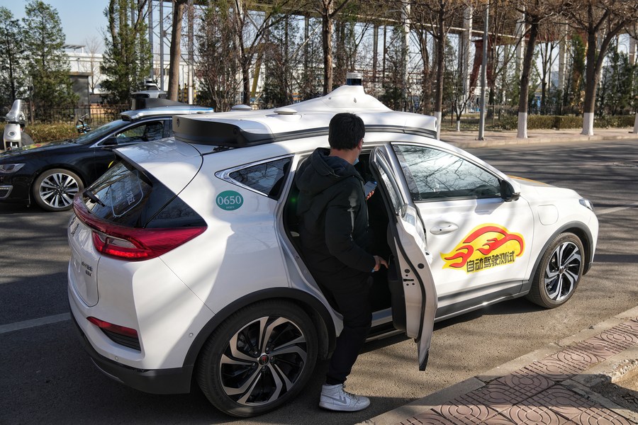 Photo taken on Nov. 25, 2021 shows a passenger prepares to take a self-driving taxi in Beijing. (Xinhua/Peng Ziyang)