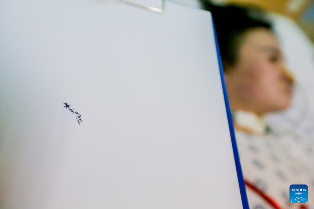 Li Jinxin, a 26-year-old Chinese woman, writes her name assisted by her nurse Sherricka Mae Navalta at the Medical City hospital in Pasig City, the Philippines, Dec. 13, 2021. Li Jinxin has found her dream of returning home come true after battling a devastating illness for almost two and a half years in the Philippines that nearly cost her life.(Xinhua/Rouelle Umali)