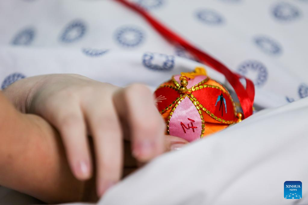 Li Jinxin, a 26-year-old Chinese woman, holds a Xiuqiu, ball made of stripes of silk, at the Medical City hospital in Pasig City, the Philippines, Dec. 13, 2021. Li Jinxin has found her dream of returning home come true after battling a devastating illness for almost two and a half years in the Philippines that nearly cost her life.(Xinhua/Rouelle Umali)