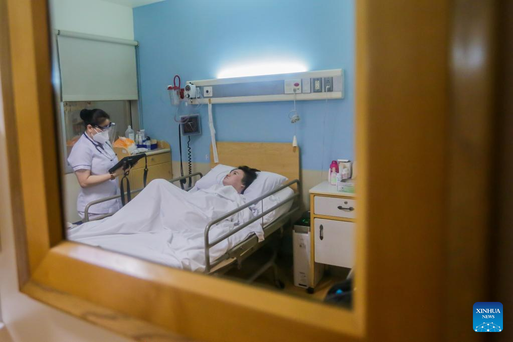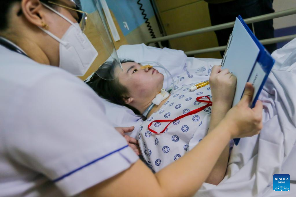 Nursing workers take care of Li Jinxin, a 26-year-old Chinese woman, at the Medical City hospital in Pasig City, the Philippines, Dec. 13, 2021. Li Jinxin has found her dream of returning home come true after battling a devastating illness for almost two and a half years in the Philippines that nearly cost her life. (Xinhua/Rouelle Umali)
