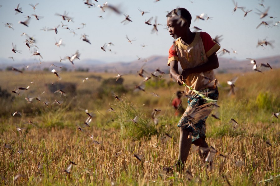 A boy clears locusts from a rice field during a locust campaign in Madagascar, May 8, 2014. (Xinhua/Mika Rajaonarison)