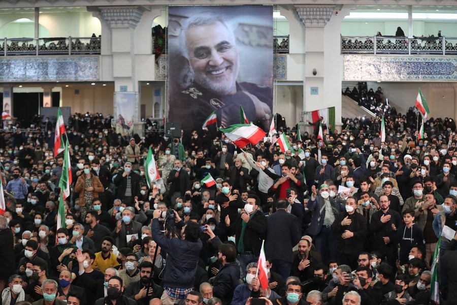 Iranian people attend a gathering to mark top Iranian General Qassem Soleimani's second martyrdom anniversary in Tehran, Iran, Jan. 3, 2022. (Xinhua/Gao Wencheng)